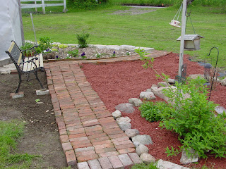 So far, I'm much happier with the space. It gave me a great spot to place the bench, which has more planting space behind it. I still have lots of work ahead of me, to get it all filled in with plants and finish the mulching, but so far, I'm rather pleased with it. This is the first time I've ever put down bricks. I think I may plan on continuing the path up to the sidwalk that runs along the main garden, that is, if I can find more bricks again. ....... So we definately have a lot of plans still ahead of us ..... garden expansions have been started in 4 places.... 1 other is shown below......